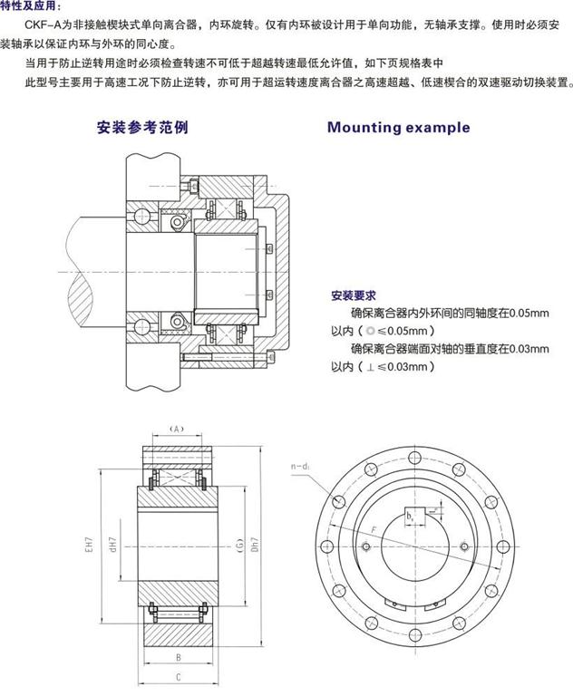 CKF-A為非接觸楔塊式單向離合器,內(nèi)環(huán)旋轉(zhuǎn)。