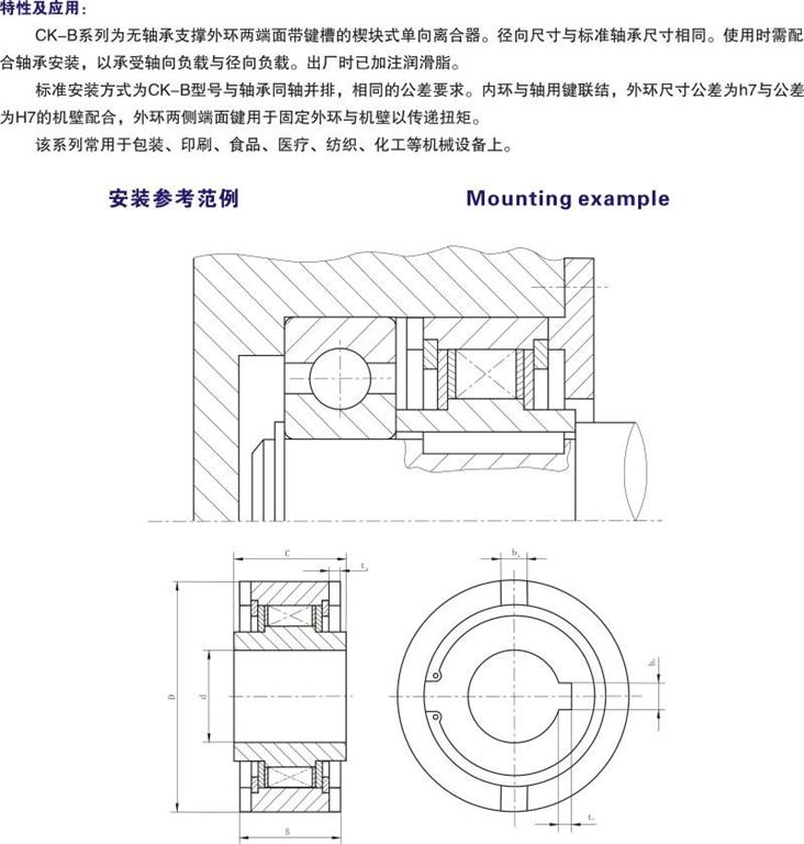 CK-B系列為無(wú)軸承支撐外環(huán)兩端面帶鍵槽的楔塊式單向離合器。