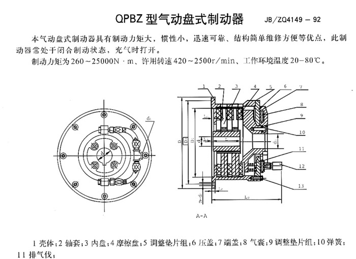 QPBZ型氣動盤式制動器具有制動力矩大,慣性小,迅速可靠、結構簡單維修方便等優點,常處于閉合制動狀態,充氣時打開。