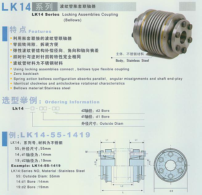 脹套--波紋管聯軸器采用高柔性不銹鋼,具有高扭矩剛性,軸向、徑向和角度錯位在平穩均勻中得到補償,使用脹緊方式,安裝空間小,裝卸方便。