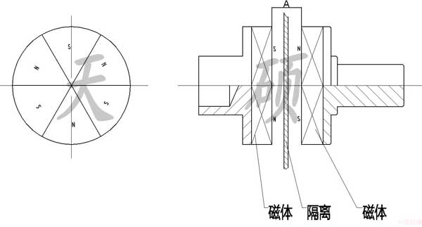 但同時,在磁場的作用下,軸向力(互相吸引)也成正比變化。軸向力是這種平面型傳動器的主要缺點。另外,由于傳遞的扭矩大小與圓盤面積有關,因此,這種傳動器的扭矩不能做的太大,否則會導致尺寸過大,安裝困難。 結構簡單,成本低廉,是平面型傳動器的主要優點。因此在某些微型隔離傳動方面有成功應用。目前,常用的簡單結構平面型傳動器,扭矩一般都在10Nm以下。