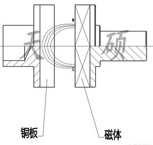 主動盤上,按照NS交叉的方式安裝高性能磁體。從動盤由導電性能良好的銅材制成。磁力線穿過銅盤。主動盤旋轉,渦流帶動從動銅盤跟隨轉動。渦流傳動,可以是同步或非同步兩種狀態。確切地說,同步的渦流傳動,一般存在少量(5%)的不同步。如,輸入1000rpm,輸出950rpm。這種不同步,可以被接受為是傳動損失。
